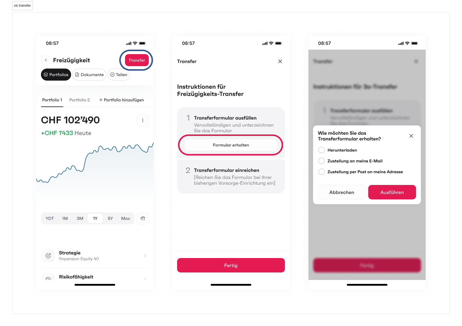 Haben Sie sich registriert? Dann senden wir Ihnen automatisch ein Transferformular per E-Mail zu. Als Alternative können Sie das Formular auch in der App herunterladen. Dazu müssen Sie wie folgt vorgehen: